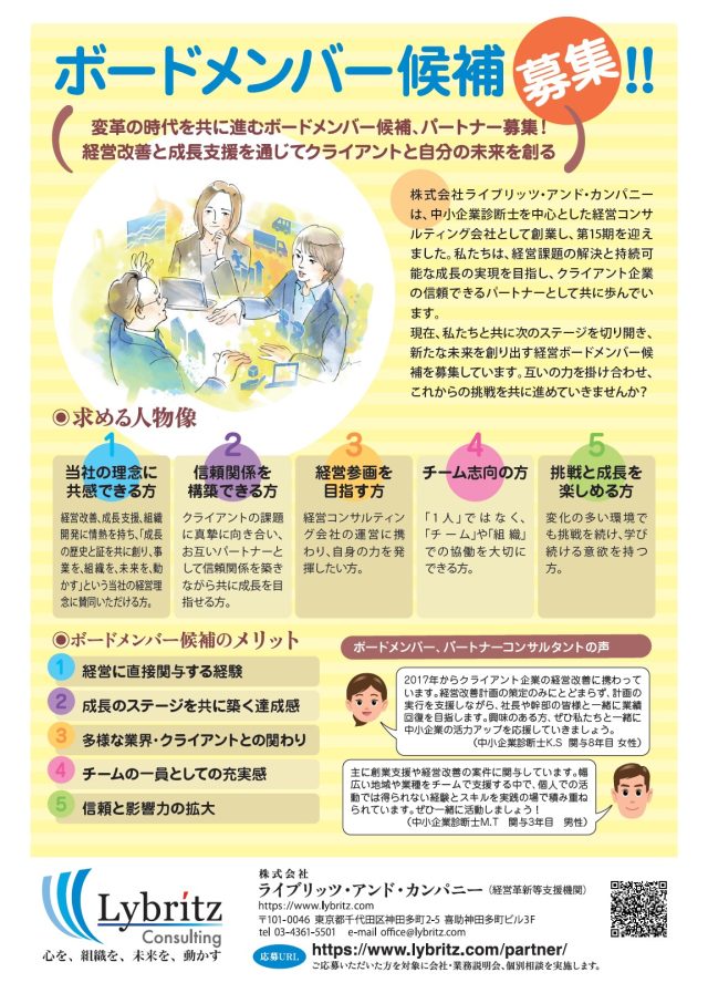 ご興味のある方は、下記より「ライブリッツ経営チームメンバー候補チラシ(PDF)※実際に今、当社で一緒に仕事をしているメンバーの飾らない声が載ってます!」をダウンロードいただけます。あなたと未来のクライアントをつなぐ第一歩になるかもしれません。
